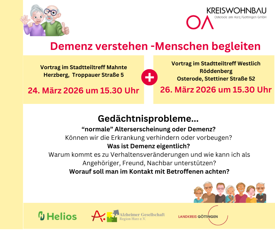 Vergesslichkeit – gehört das einfach zum Älterwerden oder steckt mehr dahinter? Was ist Demenz eigentlich? Kann man vorbeugen? Warum kommt es zu Verhaltensveränderungen? Und wie können Angehörige, Freunde oder Nachbarn unterstützend begleiten? Antworten auf diese und weitere Fragen erhalten Sie in unserem Vortrag: 📅 24. März 2026 | 15:30 Uhr 📍 Stadtteiltreff Mahnte Troppauer Straße 5, Herzberg 🎤 Referentinnen: Tanja Bode – Demenzbeauftragte Heliosklinik Herzberg/Osterode Jutta Kindereit – Demenzberaterin Alzheimergesellschaft Harz Senioren- und Pflegestützpunkt des Landkreises Göttingen 📅 Zusatztermin: 🗓 26. März 2026 📍 Stadtteiltreff Westlich Röddenberg Demenz verstehen – Menschen begleiten.