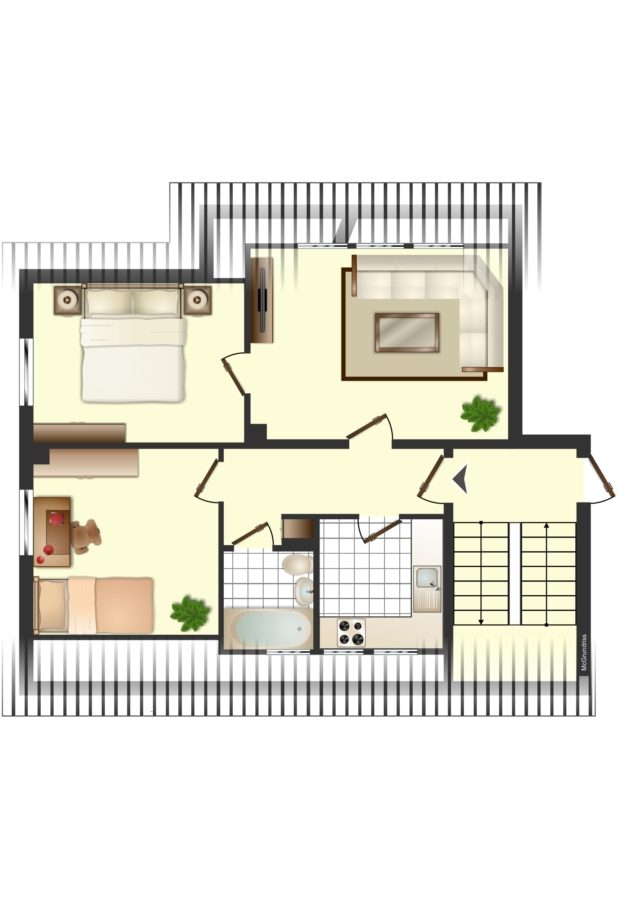 Die 3-Zimmer befindet sich im Dachgeschoss eines 6-Familienhauses. Alle Wände sind Raufaser weiß gestrichen. In den Betriebskosten sind u. a. Kosten für Wasser, Abwasser und Müllgebühren enthalten. Telefon-/Internetnutzung über Breitbandkabel ist möglich. Eine Gas-Etagen-Heizung, Rauchwarnmelder und Gegensprechanlage gehören zur Wohnungstechnik.